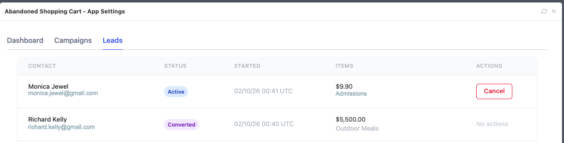 - View a table of all abandoned cart leads with readily accessible contact information for follow-up or analysis